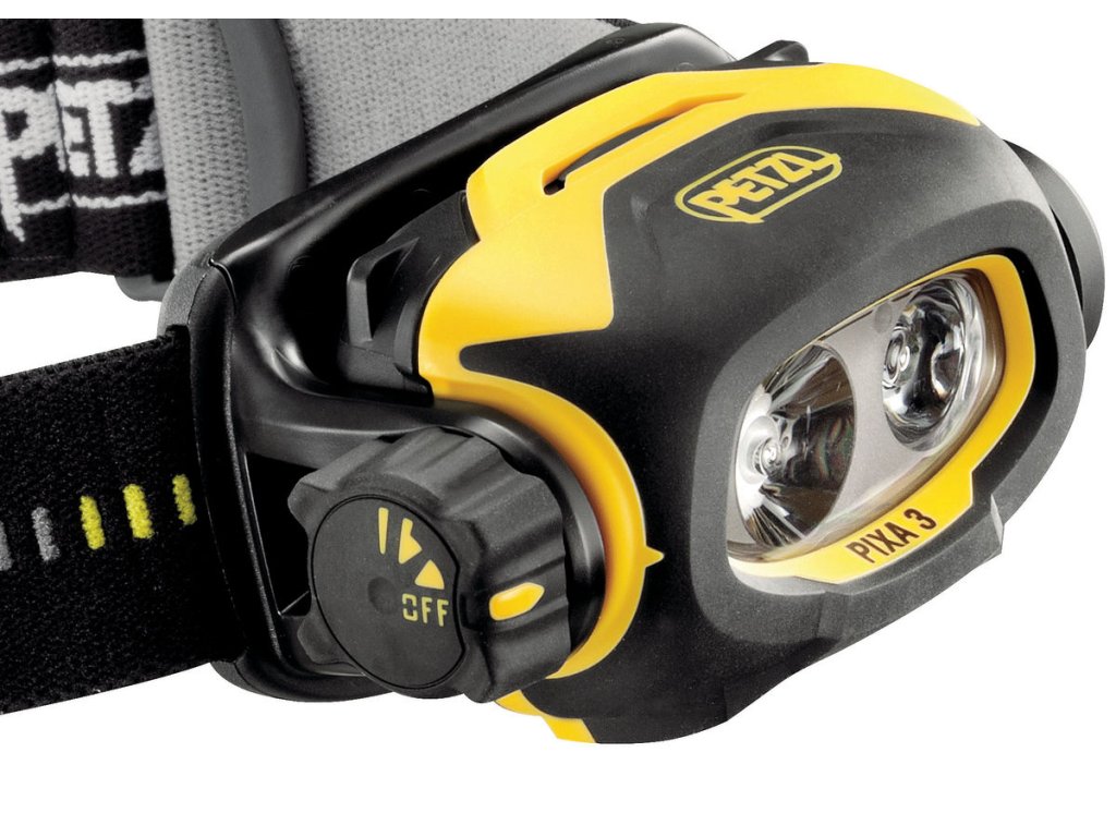 - Čelovka Petzl Pixa 3 uvolňuje ruce pro práci: lze ji nosit na hlavě s elastickým páskem, připevněnou do slotu na přilbě, nebo položenou na zemi.