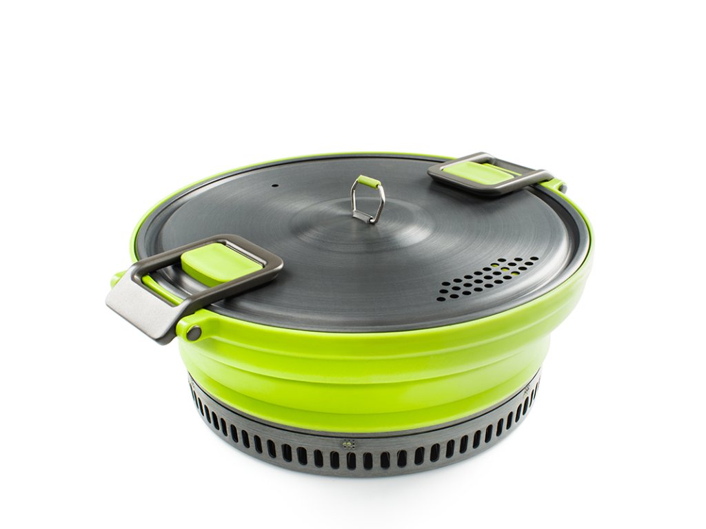 Efektivní skládací hrnec s důmyslným systémem pro dokonalý rozvod tepla. Dno hrnce a perforovaná poklička jsou vyrobeny z tvrdě eloxovaného hliníku, který zaručuje nejvyšší efektivitu rozvodu tepla, chemickou odolnost a zachovává velmi nízkou hmotnost. Vnitřní dno hrnce GSI EscapeHS Pot je z 3-vrstvého eloxovaného hliníku, tvrzeného pomocí technologie Radiance, tedy maximálně nepřilnavý povrch, odolný proti poškrábání. Skládací bočnice a chrániče na palce jsou ze silikonu. Hrnec lze složit do minimální výšky 5,3cm. Hrnec GSI EscapeHS Pot je vhodný pro všechny typy outdoorových vařičů. Rozhodně však není konstruovaný na ohřev ve volném ohni.