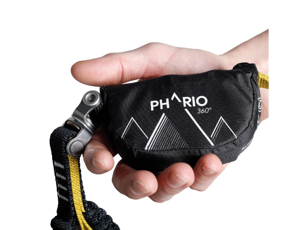 Singing Rock Phario 360° New je nová generace páracího tlumiče pádové energie s obrtlíkem, pro zajištěné cesty, lanová centra a lanové parky s dlaňovými Keylock karabinami v souladu s novou normou EN958:2017. Nová kapsička na tlumič s indikátorem pádu uvnitř a nový minimalistický popruh šíře 27 mm snižující celkovou hmotnost tlumiče pádu.